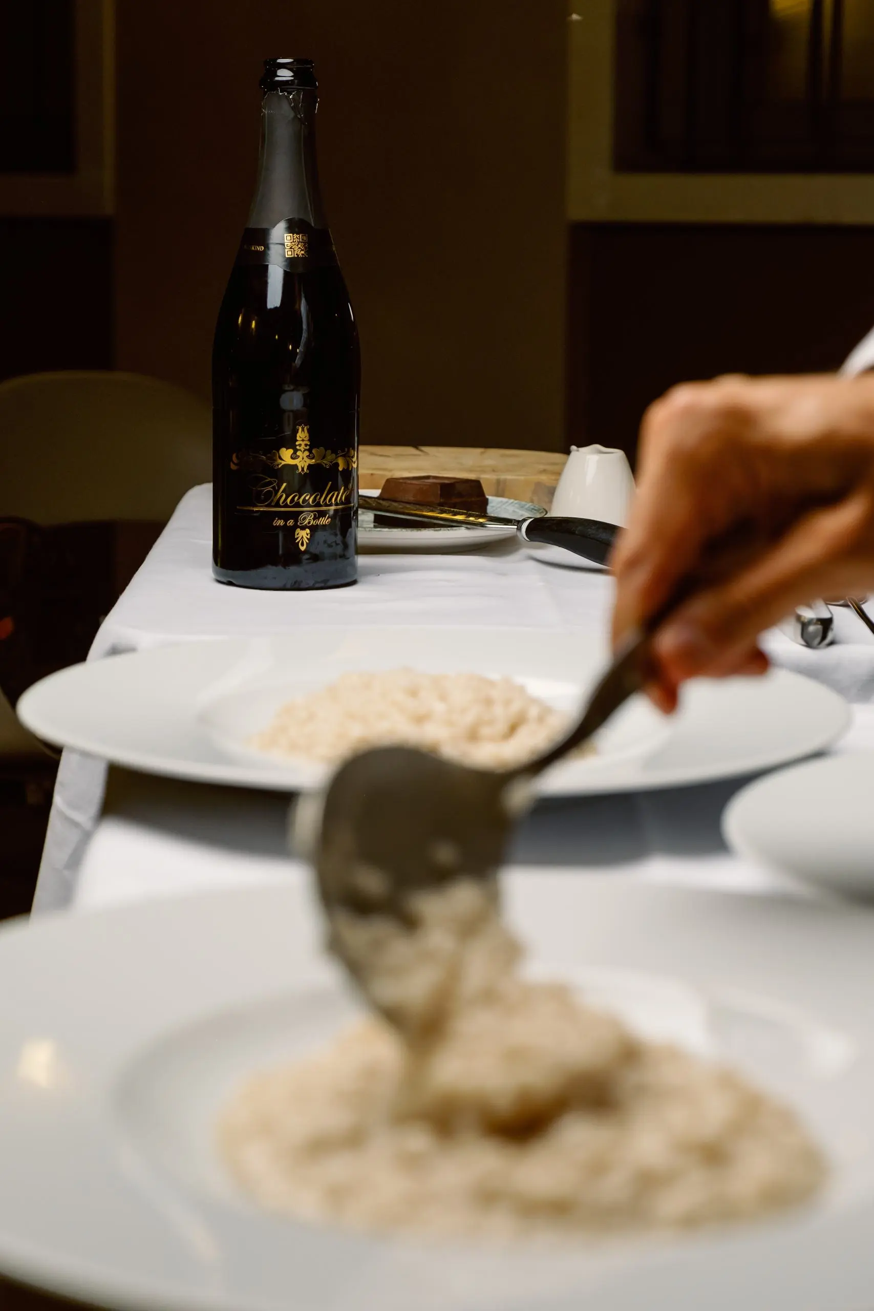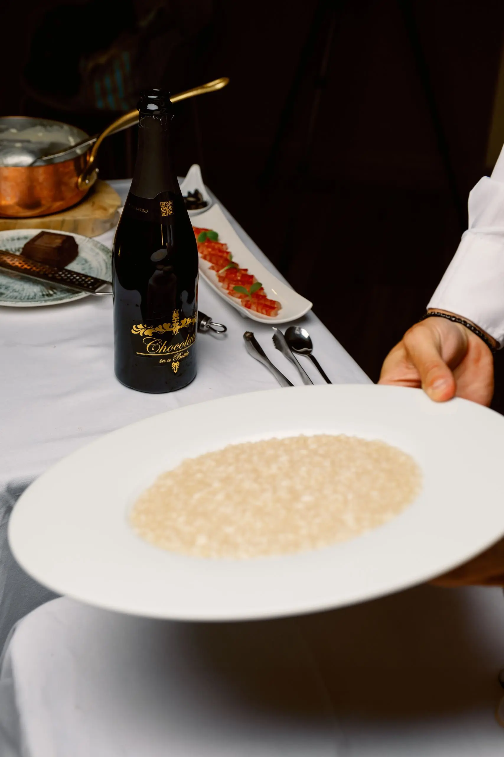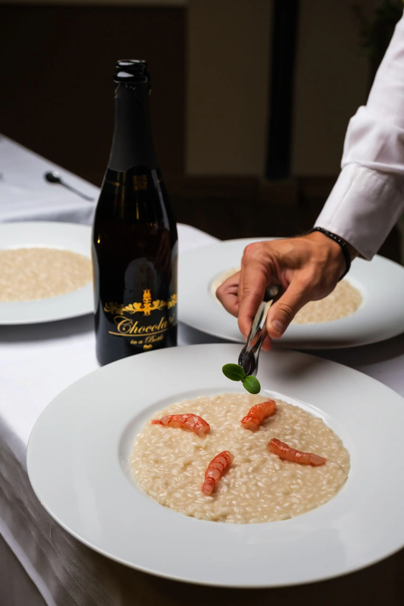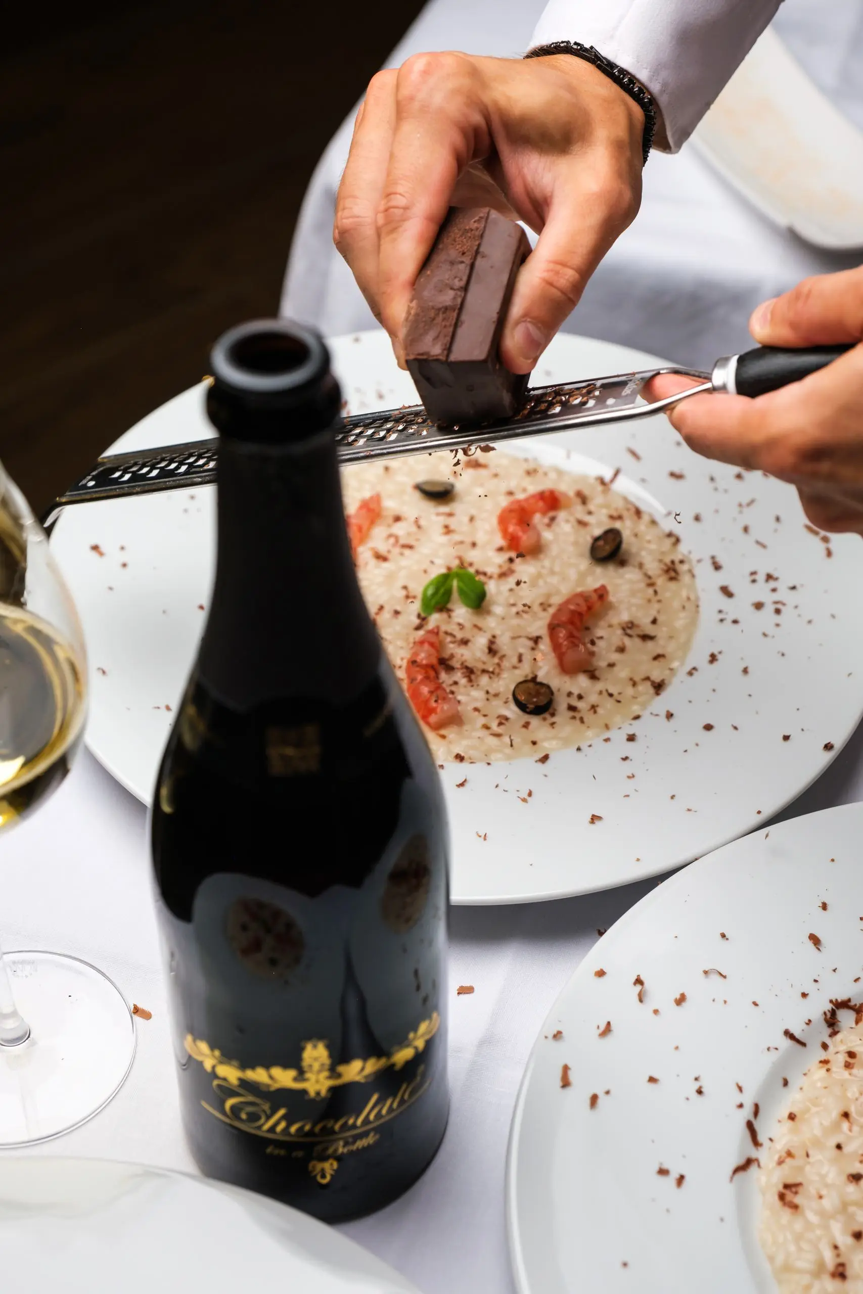Den Reis mit etwas Zwiebel und Knoblauch rösten und mit der zuvor zubereiteten Fischbrühe weiterkochen. Nach dem Kochen Chocolate in a Bottle vom Herd nehmen und servieren. Mit rohen sizilianischen roten Garnelen, frischen Blaubeeren und dunklen Schokoladenflocken garnieren.