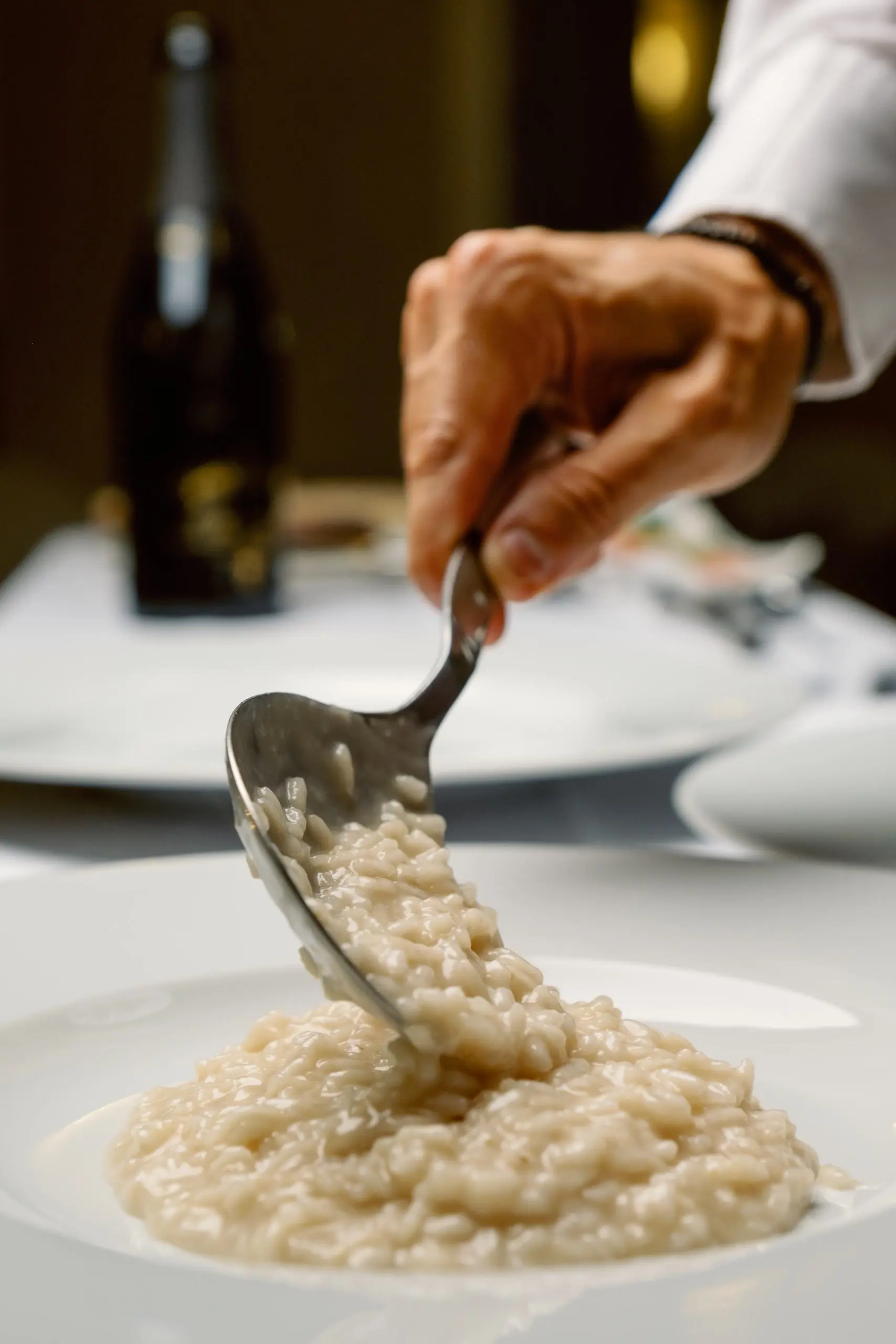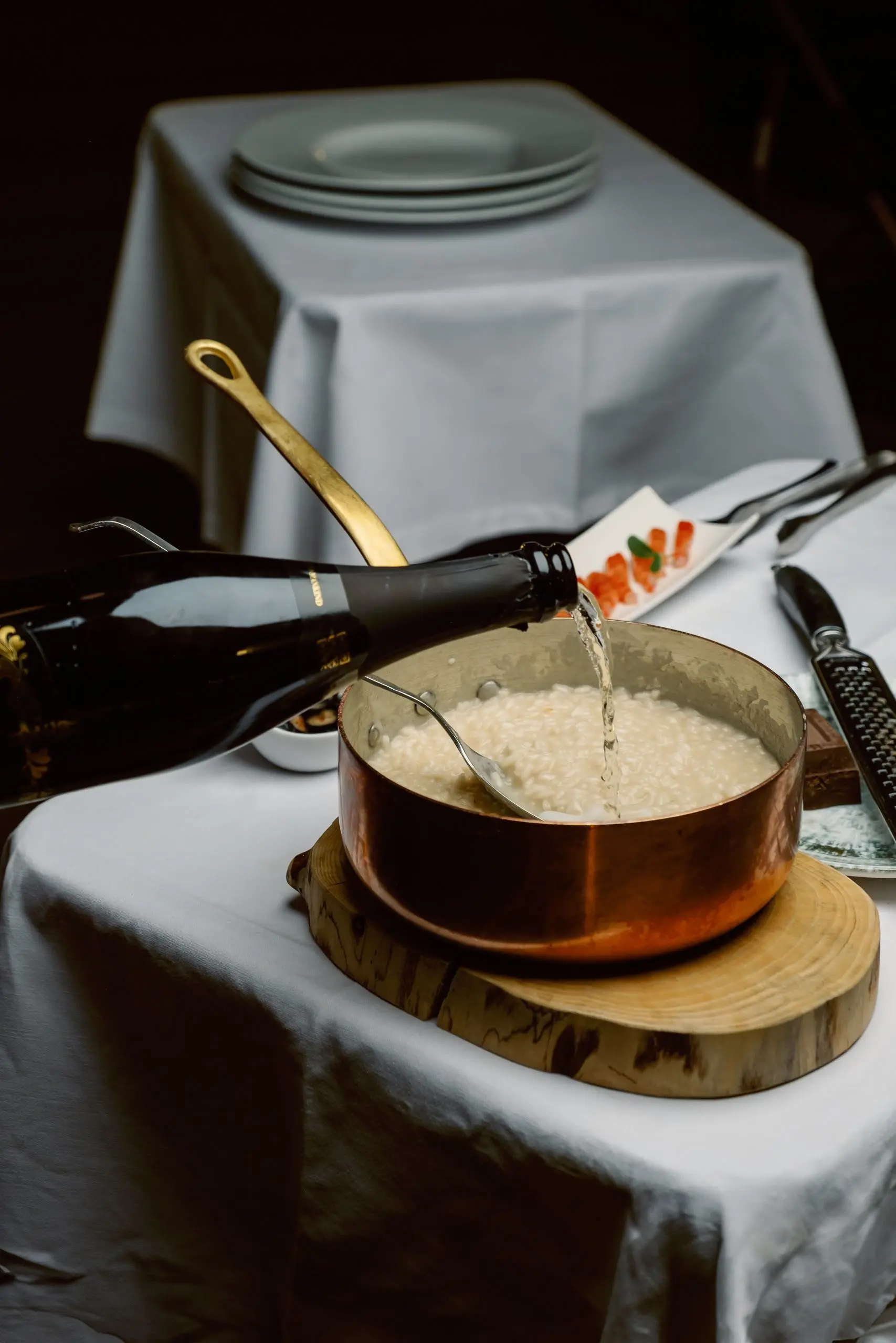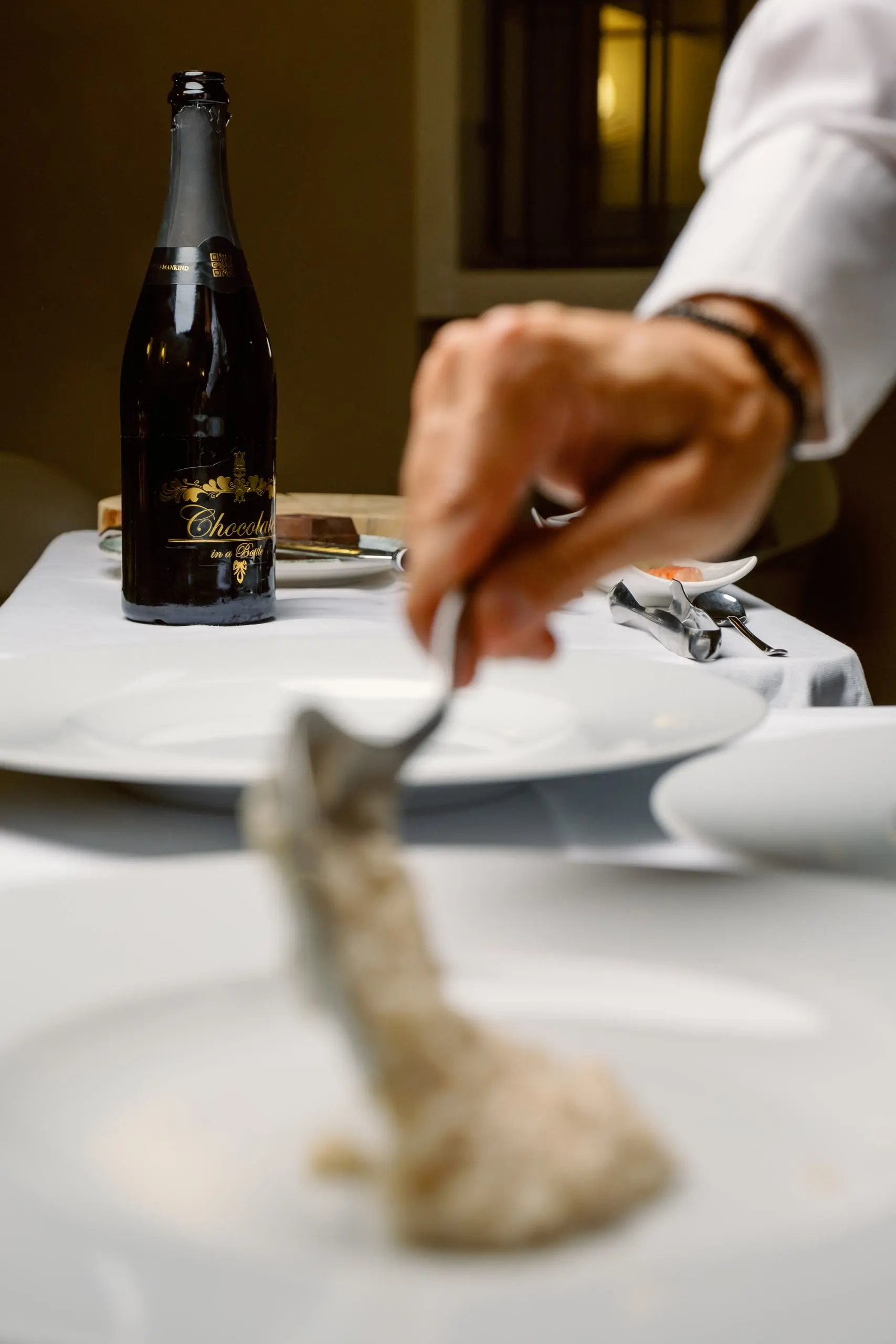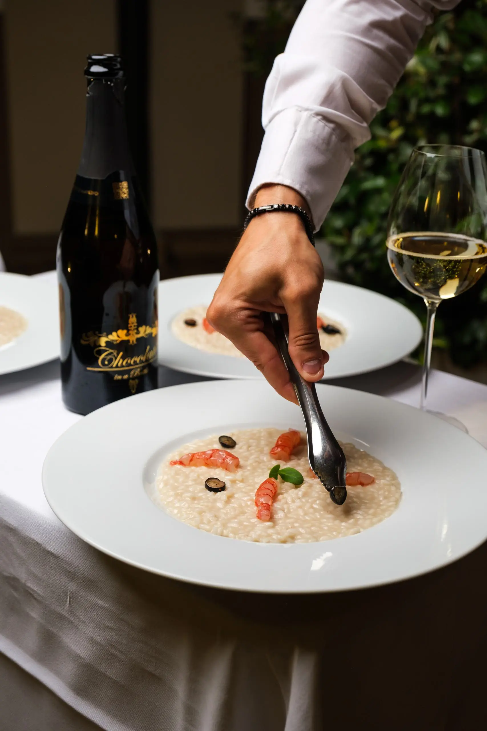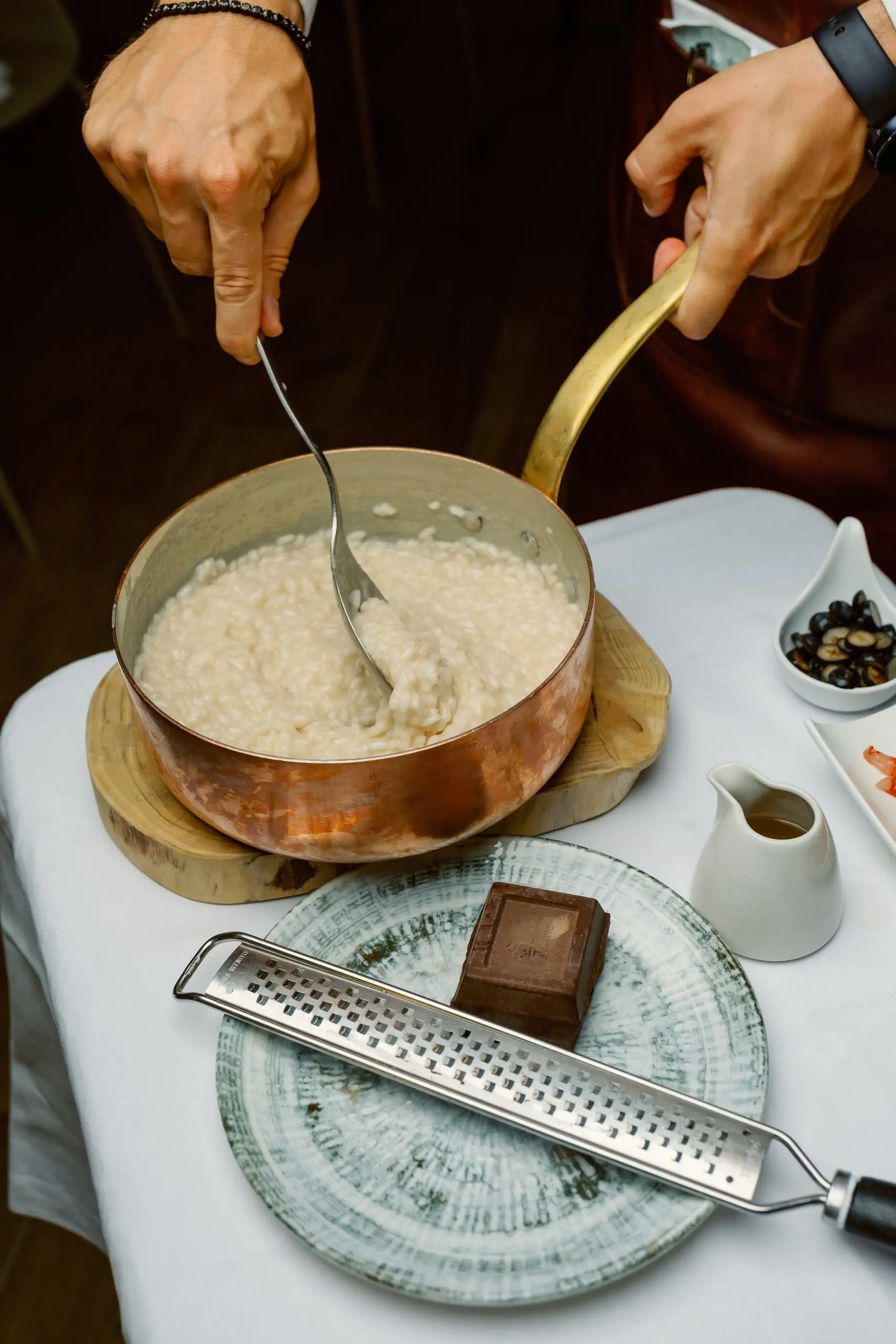 Den Reis mit etwas Zwiebel und Knoblauch rösten und mit der zuvor zubereiteten Fischbrühe weiterkochen. Nach dem Kochen Chocolate in a Bottle vom Herd nehmen und servieren. Mit rohen sizilianischen roten Garnelen, frischen Blaubeeren und dunklen Schokoladenflocken garnieren.