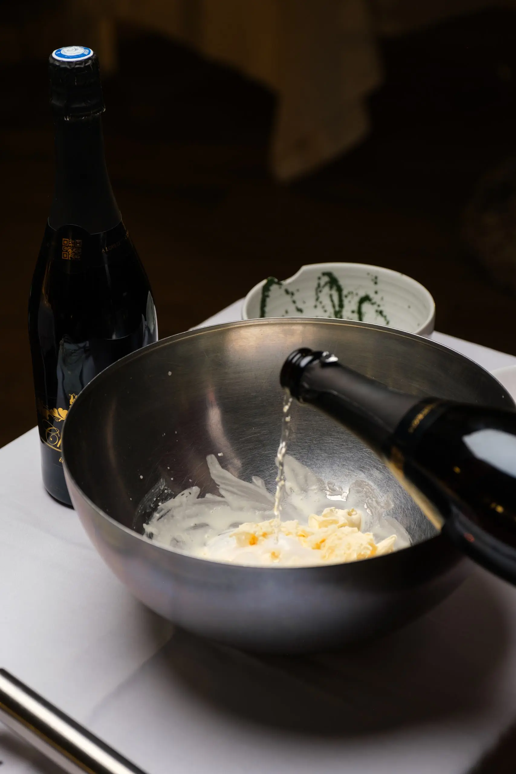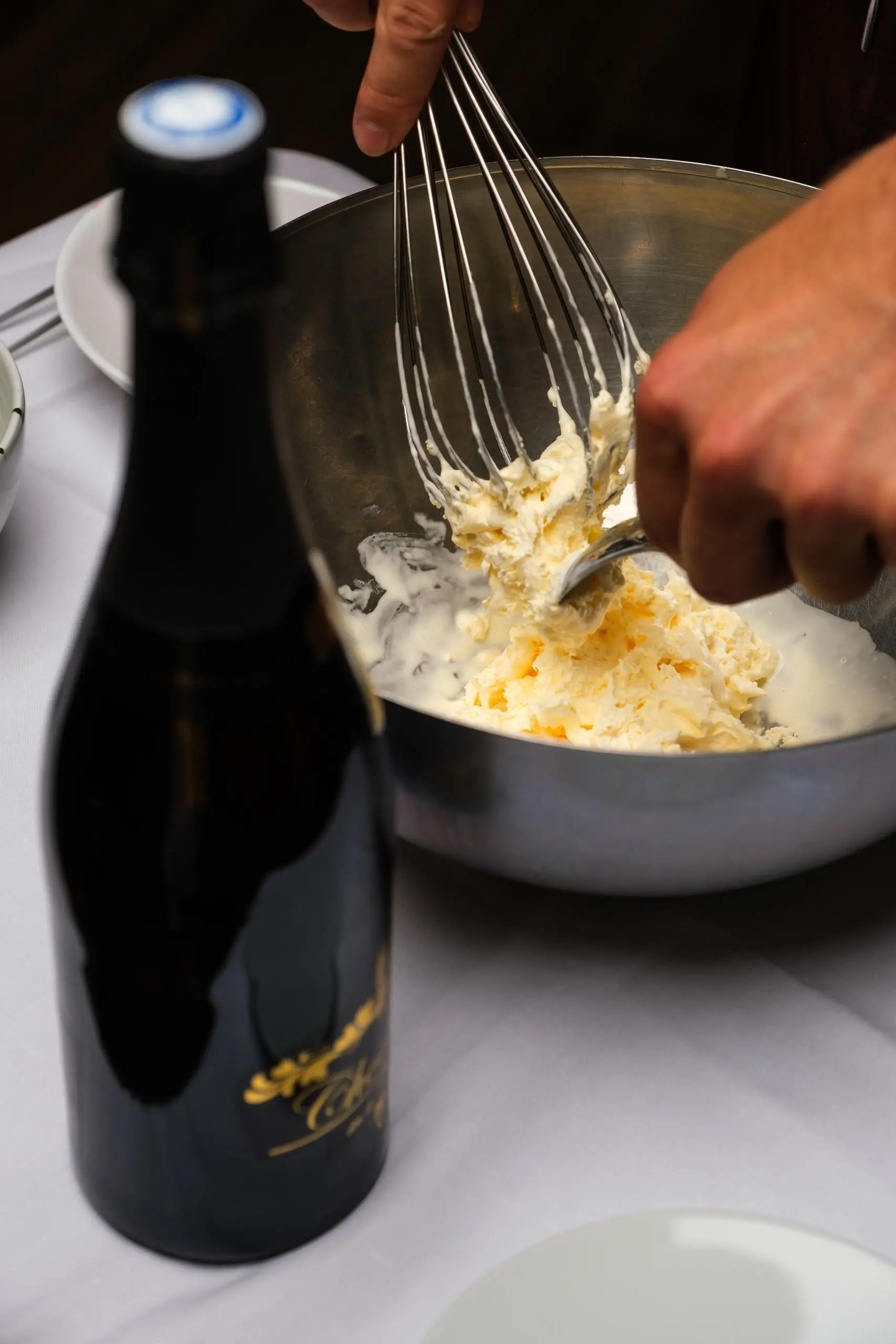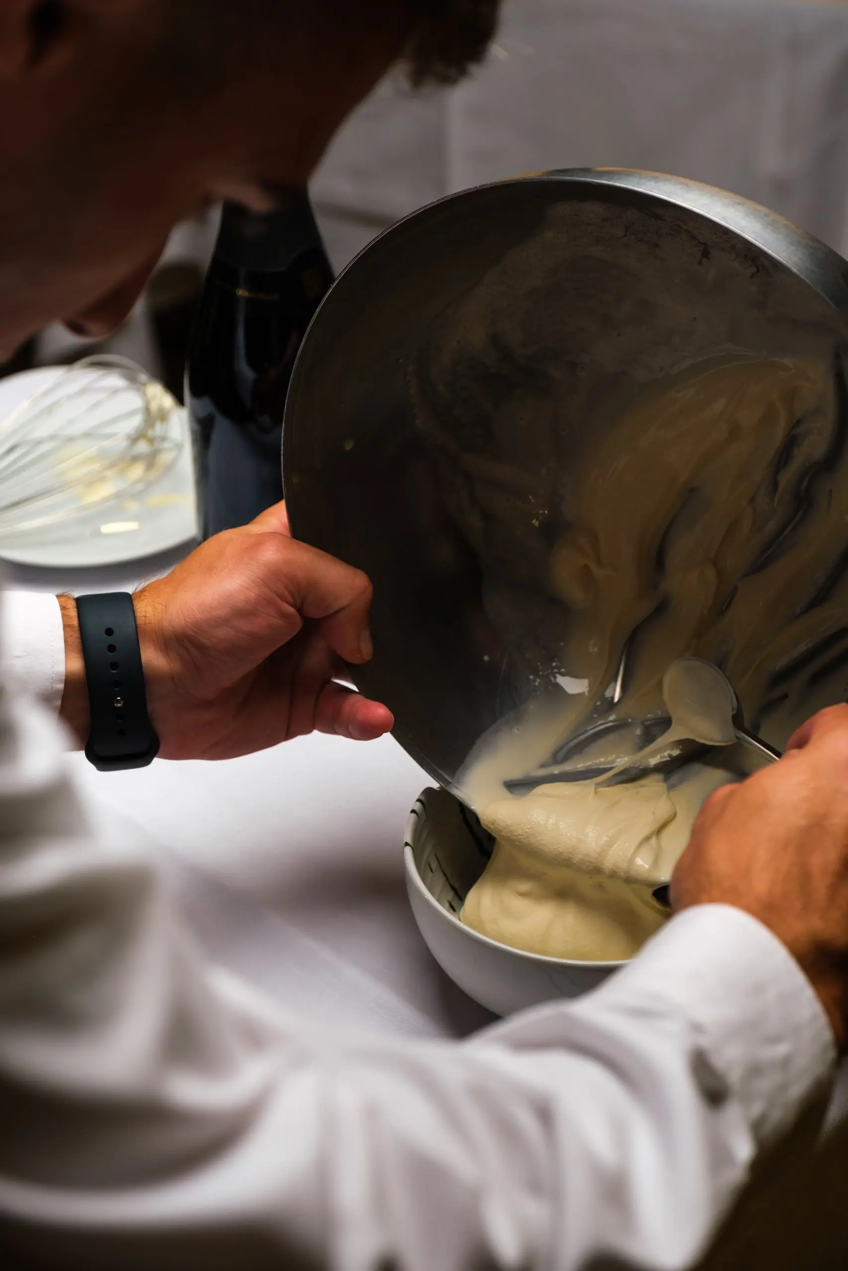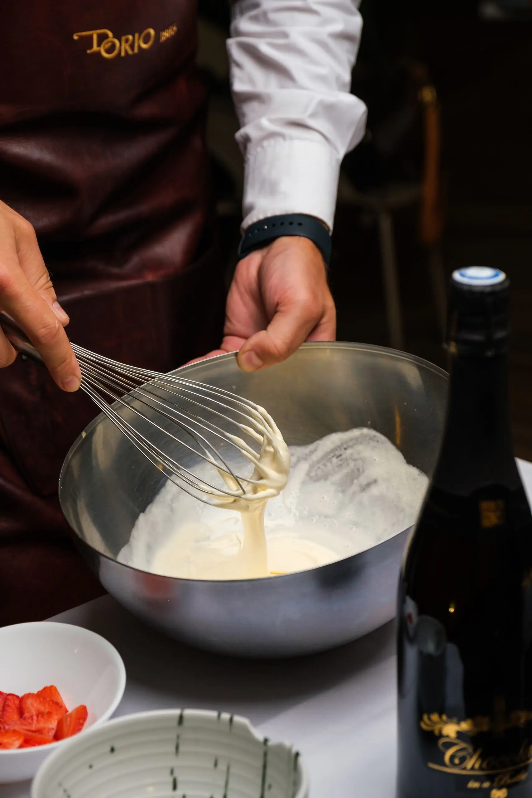 Den Reis mit etwas Zwiebel und Knoblauch rösten und mit der zuvor zubereiteten Fischbrühe weiterkochen. Nach dem Kochen Chocolate in a Bottle vom Herd nehmen und servieren. Mit rohen sizilianischen roten Garnelen, frischen Blaubeeren und dunklen Schokoladenflocken garnieren.