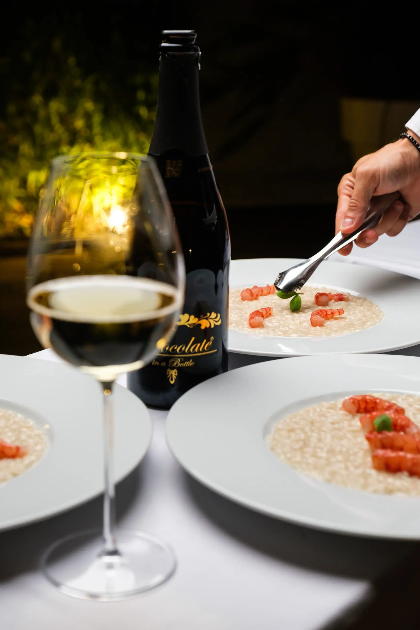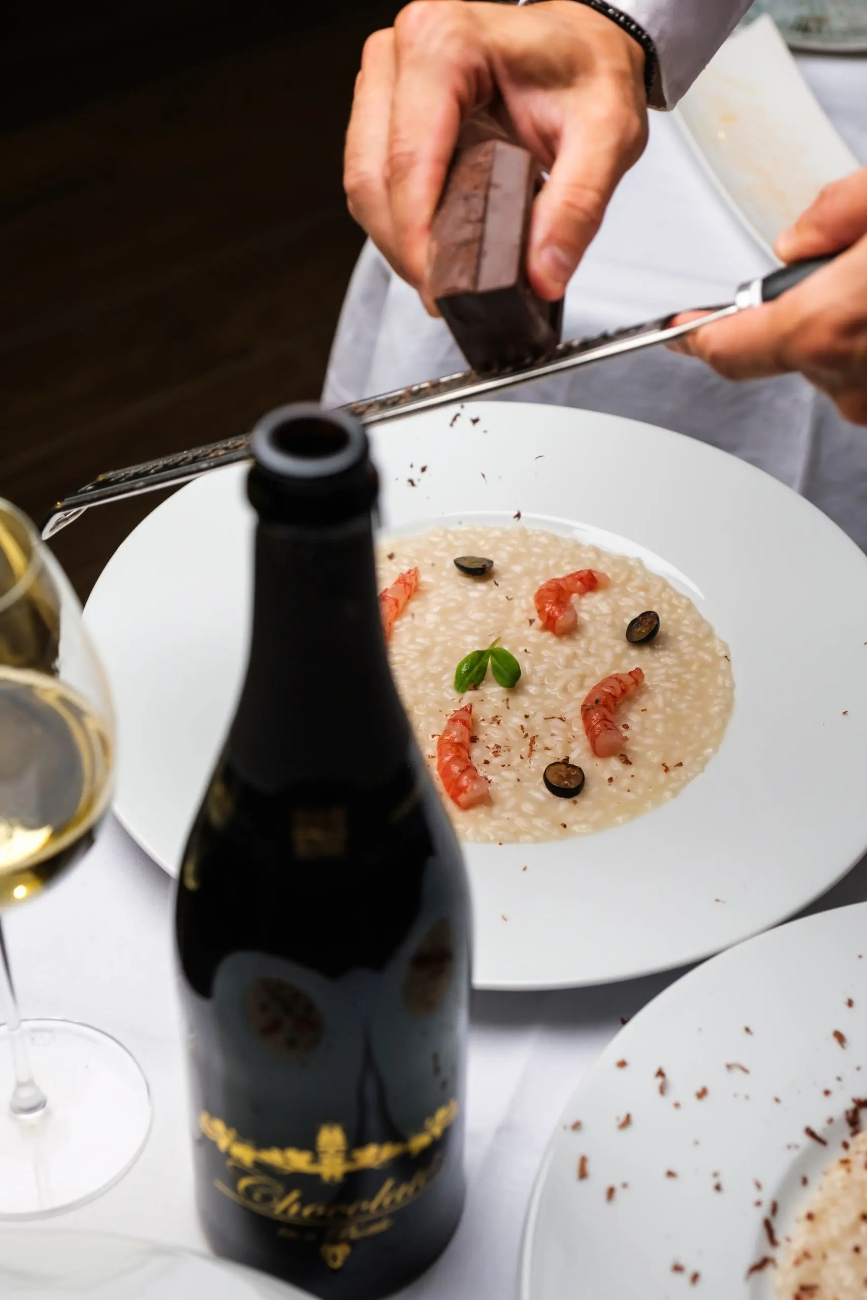 Risotto mit cremiger Chocolate in a Bottle, rohen roten Garnelen aus Sizilien, Blaubeeren und dunklen Schokoladenflocken